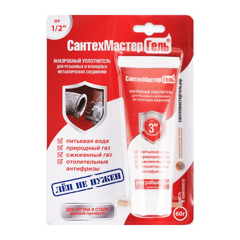 САНТЕХМАСТЕРГЕЛЬ Анаэробный клей-герметик д/уплотнения резьбовых соединений до 3", красный, 60гр